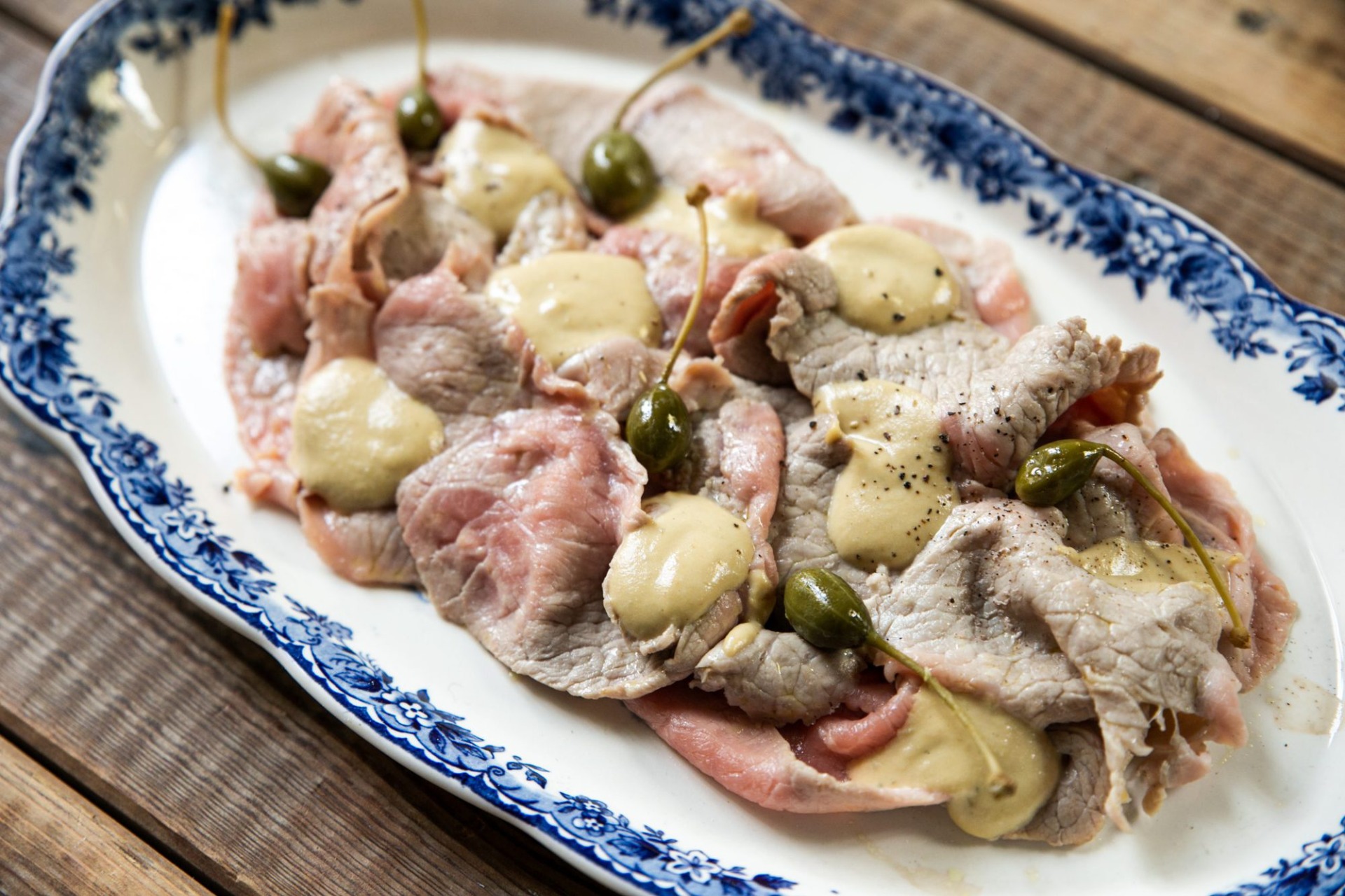 la moyonesa y sazónese todo. Se corta la ternera a rodajas, y se cubre con la salsa y se adorna con alcaparras y pepinillos trinchados. Sírvase muy frío.