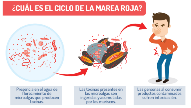 "Marea Roja" es el término utilizado para referirse a los Fenómenos Algales Nocivos (FAN), caracterizados por un aumento excesivo en el número de algas microscópicas que producen un veneno que afecta al ser humano y a los animales. Estos compuestos son acumulados en los mariscos y permanecen en ellos, independiente de que ellos sean consumidos cocidos, o utilizando limón, vinagre u otro tipo de ingrediente.